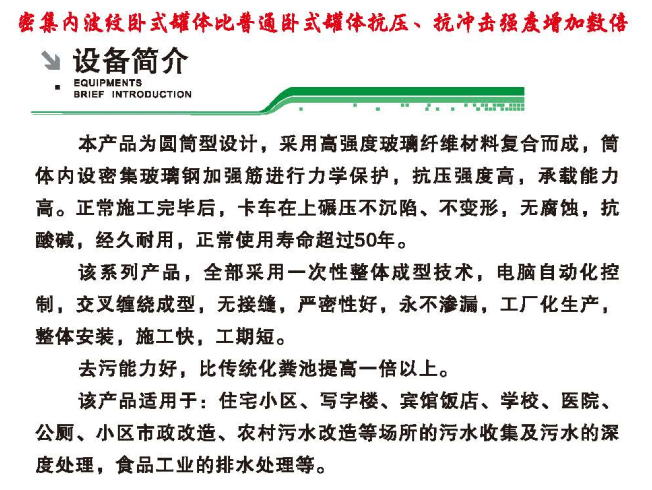 本产品为圆筒型设计,采用高强度玻璃纤维材料复合而成,全部采用一次性整体成型技术,电脑自动化控制,交叉缠绕成型,无接缝。筒体内设密集玻璃钢加强筋进行力学保护,抗压强度高,承载能力强。正常施工完毕后,卡车在上面碾压不沉陷、不变形、,无腐蚀,抗酸碱,经久耐用,正常使用寿命超过50年,咨询热线:18071740880
